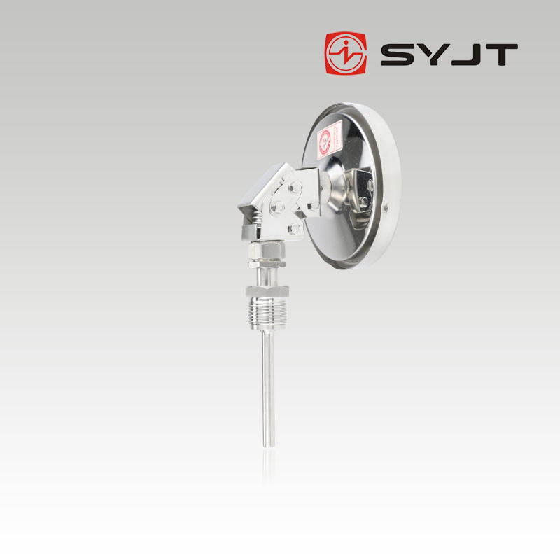WSS不锈钢双金属温度计万向型,本厂生产的双金属温度计其保护管、节头、锁紧螺栓等均采用1Cr18Ni9Ti材料,表壳采用铝板拉伸成型经切削加工表面黑色电泳处理,表盖与表盒采用环型双层橡胶圈螺纹密封锁紧结构,故仪表整体防水防腐性能良好,径向型仪表采用弯管型结构,外型新颖、轻巧、美观与众不同。