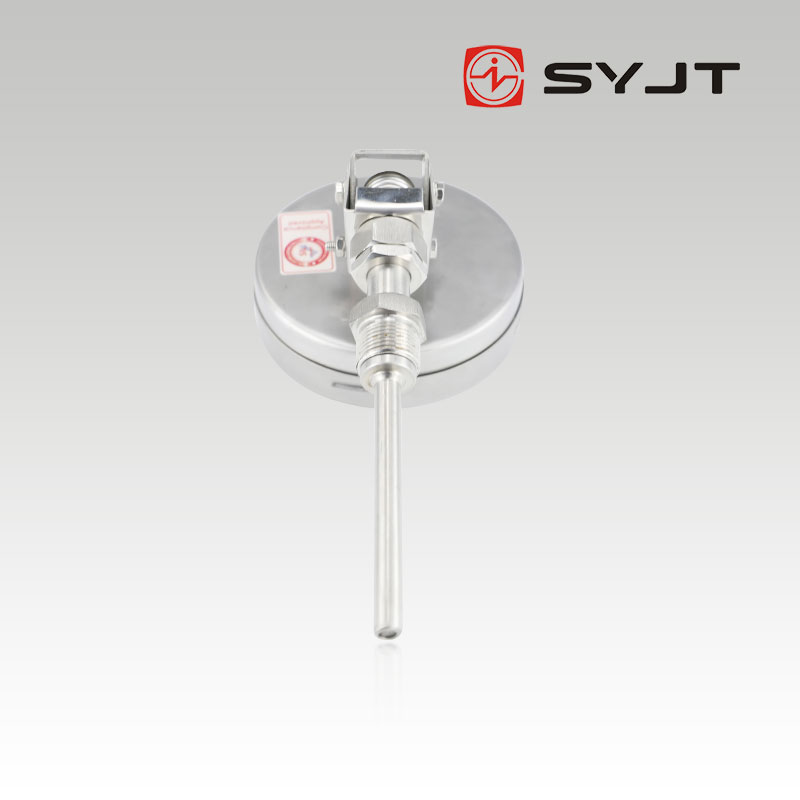 WSS 不锈钢双金属温度计 万向型,本厂生产的双金属温度计其保护管、节头、锁紧螺栓等均采用1Cr18Ni9Ti材料,表壳采用铝板拉伸成型经切削加工表面黑色电泳处理,表盖与表盒采用环型双层橡胶圈螺纹密封锁紧结构,故仪表整体防水防腐性能良好,径向型仪表采用弯管型结构,外型新颖、轻巧、美观与众不同。