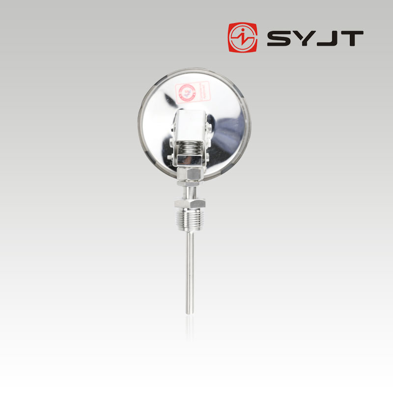 WSS不锈钢双金属温度计万向型,本厂生产的双金属温度计其保护管、节头、锁紧螺栓等均采用1Cr18Ni9Ti材料,表壳采用铝板拉伸成型经切削加工表面黑色电泳处理,表盖与表盒采用环型双层橡胶圈螺纹密封锁紧结构,故仪表整体防水防腐性能良好,径向型仪表采用弯管型结构,外型新颖、轻巧、美观与众不同。