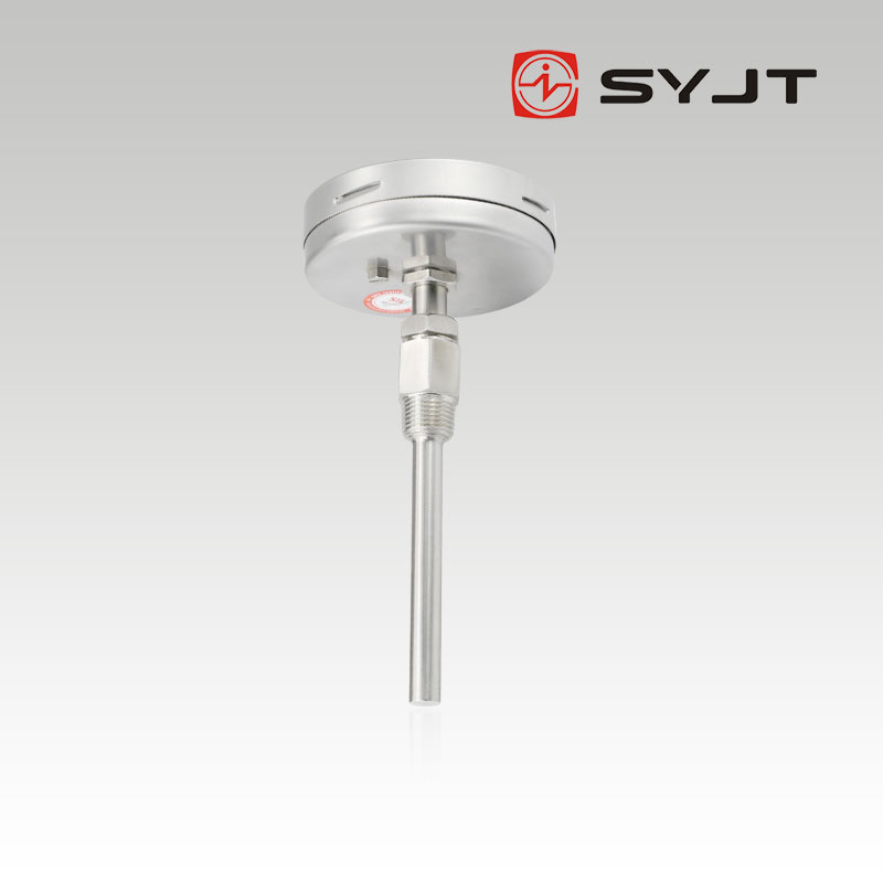 WSS不锈钢双金属温度计轴向型,本厂生产的双金属温度计其保护管、节头、锁紧螺栓等均采用1Cr18Ni9Ti材料,表壳采用铝板拉伸成型经切削加工表面黑色电泳处理,表盖与表盒采用环型双层橡胶圈螺纹密封锁紧结构,故仪表整体防水防腐性能良好,径向型仪表采用弯管型结构,外型新颖、轻巧、美观与众不同。