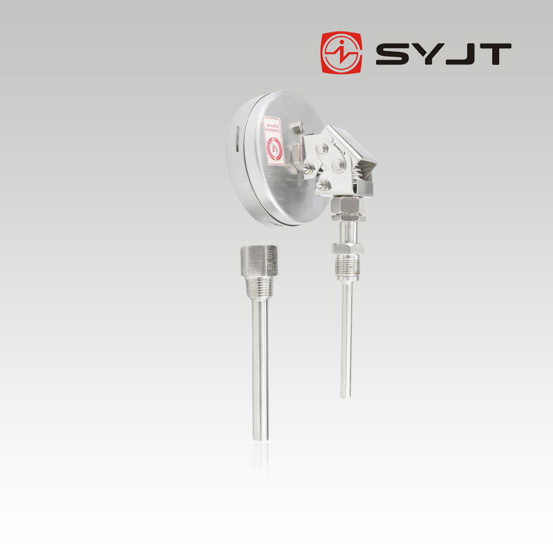 WSS 不锈钢双金属温度计 万向型,本厂生产的双金属温度计其保护管、节头、锁紧螺栓等均采用1Cr18Ni9Ti材料,表壳采用铝板拉伸成型经切削加工表面黑色电泳处理,表盖与表盒采用环型双层橡胶圈螺纹密封锁紧结构,故仪表整体防水防腐性能良好,径向型仪表采用弯管型结构,外型新颖、轻巧、美观与众不同。